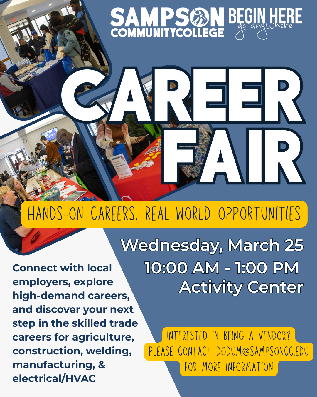 Sampson County Economic Development is proud to help promote the upcoming Spring 2026 Career Fair hosted by Sampson Community College. This an important opportunity for local employers to connect directly with students who will be entering the workforce.